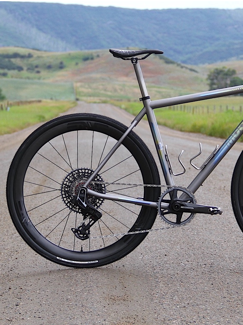 The core of the bike starts off with a threaded T47 bottom bracket, the rear end now features UDH compatibility, while the front end gets enhanced with an all-new integrated cockpit and an improved version of the legendary Moots gravel fork. No wires or hoses to be seen. The concept continues to improve stiffness where power enters the bike around the BB and dropouts while isolating the rider with lighter tubing both in the seat stays and the top tube for those all day rides. With the gravel racer in mind the Routt CRD is optimized around 40-42c tires with plenty of clearance to spare.