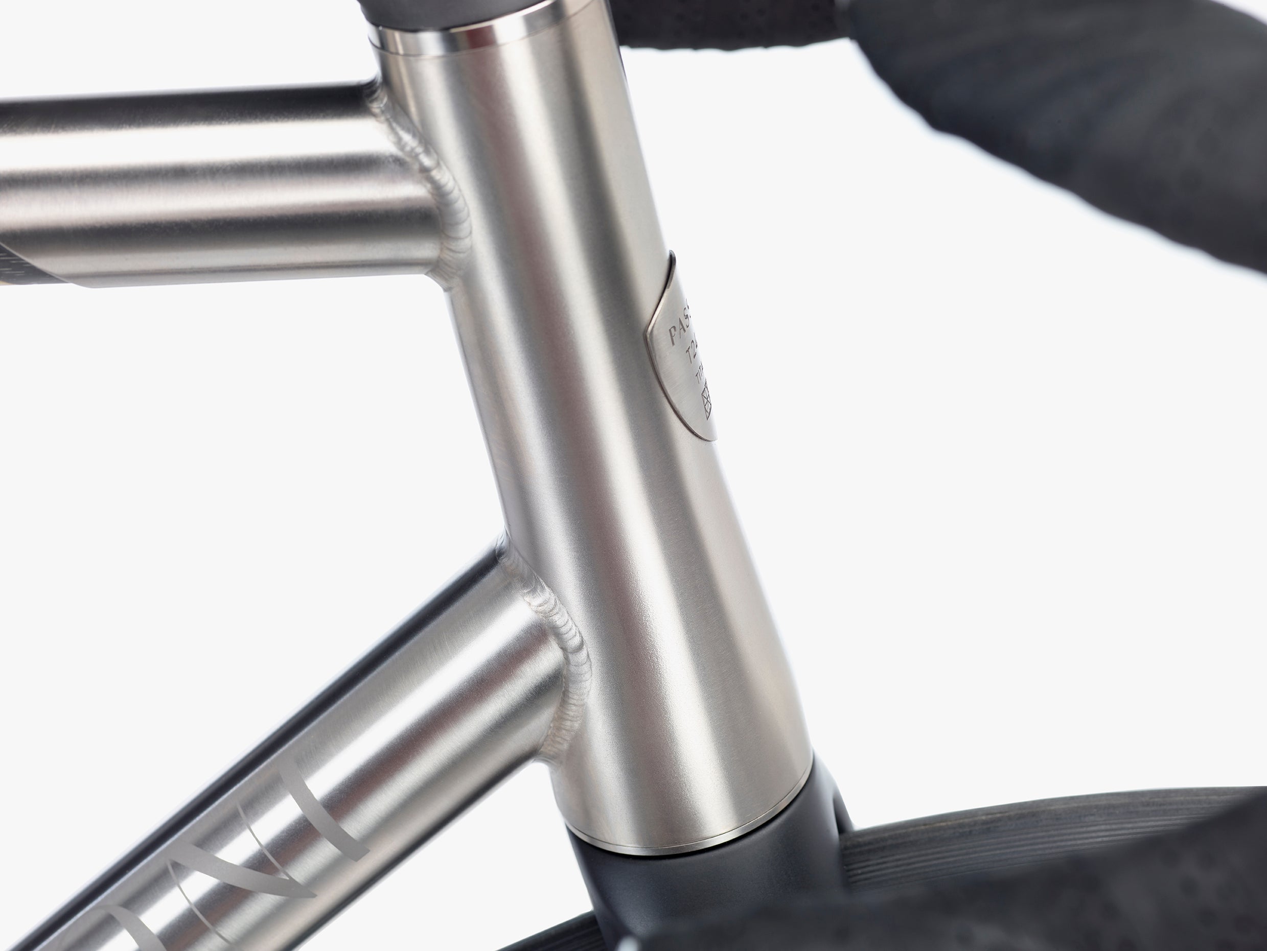 Aesthetic welding ripples, tubes machine satin finished, graphics applied directly on the tube in titanium by sandblast.